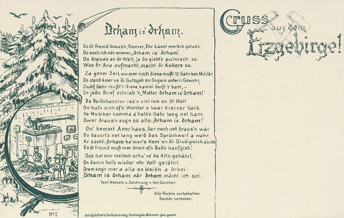 Arzgebirg, wie bist du schie! O Arzgebirg, wie bist du schie, mit deine Wälder, ihr Wiesen, Barg on Tol, in Winter weiß, in Sommer grü. O Arzgebirg, wie bist du schie! Be Regn on Sonnenschei, öb's stöbert, störmt on schneit. be Tog on Nacht, obnd oder früh, wie haamlich klingst du doch, du deitsche Mottersproch! O Arzgebirg, wie bist du schie! In Frügahr, wenn der Schnee zetaat, de Wasserle fließen, de Beer blüht in der Haad, wenn's sommt on singt in aller Früh. O Arzgebirg, wie bist du schie! Be Regn on Sonnenschei, öb's stöbert, störmt on schneit. be Tog on Nacht, obnd oder früh, wie haamlich klingst du doch, du deitsche Mottersproch! O Arzgebirg, wie bist du schie! On wenn de Schwarzbeer zeitig sei, de Saasen klinge, wie duftig richt nort's Hei, nort ka mer in de Schwamme gieh. O Arzgebirg, wie bist du schie! Be Regn on Sonnenschei, öb's stöbert, störmt on schneit. be Tog on Nacht, obnd oder früh, wie haamlich klingst du doch, du deitsche Mottersproch! O Arzgebirg, wie bist du schie! In Herbist is su still on leer, is Hei on Haazing rei, rut glüht de Vugelbeer, nort ka mer wieder hutzen gieh. O Arzgebirg, wie bist du schie! Be Regn on Sonnenschei, öb's stöbert, störmt on schneit. be Tog on Nacht, obnd oder früh, wie haamlich klingst du doch, du deitsche Mottersproch! O Arzgebirg, wie bist du schie! On kömmt de liebe Winterschzeit, nort liegt in Frieden de Haamit tief verschneit, mir fahrn mit Schneeschuh drüber hie. O Arzgebirg, wie bist du schie! Be Regn on Sonnenschei, öb's stöbert, störmt on schneit. be Tog on Nacht, obnd oder früh, wie haamlich klingst du doch, du deitsche Mottersproch! O Arzgebirg, wie bist du schie! On wenn ich ve dir scheiden muß, gilt dir ven Harzen der letzte Abschiedsgruß, ze dir do zieht mich's immer hi. O Arzgebirg, wie bist du schie! Be Regn on Sonnenschei, öb's stöbert, störmt on schneit. be Tog on Nacht, obnd oder früh, wie haamlich klingst du doch, du deitsche Mottersproch! O Arzgebirg, wie bist du schie! |