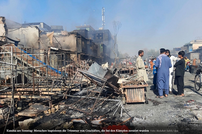 Provinzrat Amruddin Wali sagte der Nachrichtenagentur, Sicherheitskräfte und Regierungsvertreter hätten sich in das ehemalige deutsche Feldlager am Rande des Flughafens zurückgezogen. Die Regierung halte nur noch ein Gebiet rund um den Flughafen und diese Basis. Am Sonntagnachmittag Ortszeit dauerten die Gefechte rund um den Flughafen an. Kundus ist ein wichtiges Handelszentrum nahe der Grenze zum Nachbarland Tadschikistan. Die Taliban hatten die Stadt bereits 2015 und 2016 kurzzeitig eingenommen. Beide Male wurden die Islamisten durch US-Luftangriffe zurückgedrängt. Auch momentan fliegen die USA Luftschläge.
