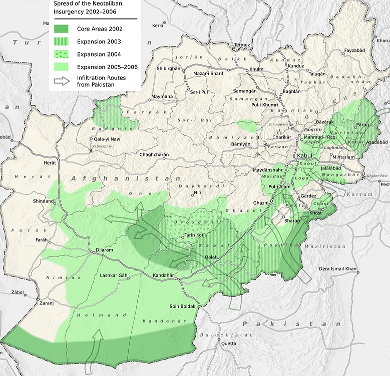 Den nach Pakistan geflohenen Führern der Taliban gelingt es, eine neue, stärker in die internationalen Dschihadistennetzwerke eingebundene Bewegung zu formieren. Vereinzelte Überfälle im ersten Jahr nach dem Sturz der Talibanregierung sind versprengten, ums Überleben kämpfenden Taliban zuzuschreiben, ab Ende 2002 folgen koordinierte Angriffe auf Staatseinrichtungen und ausländische Truppen, die sich in den folgenden Jahren, ebenso wie die Operationsgebiete der Aufständischen, ausweiten.