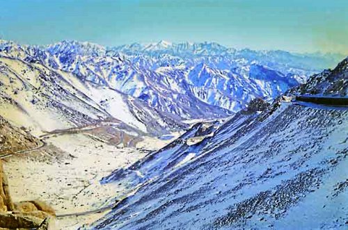 Salang-Pass; rechts hinten Lkw-Abgaswolke