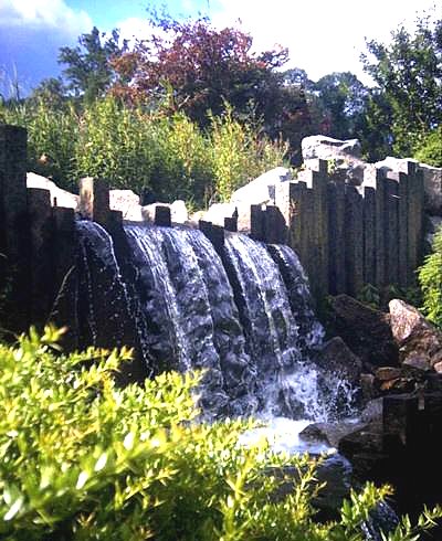 im neuen Kurpark - entstanden nach der Sanierung des Uranerzbergbaus - über Kaskaden in die Vorflut.
