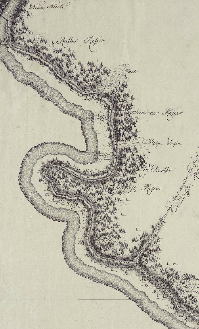 wo das heutige Rechenhaus steht. Ein Wehr (Rechen) mit einer kleinen Brücke wird errichtet und