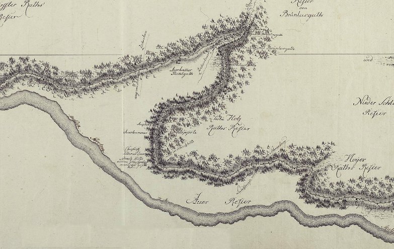 der Baumstämme, die Wasserzufuhr zum Floßgraben und das damit verbundene Wehr.