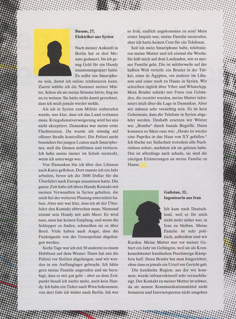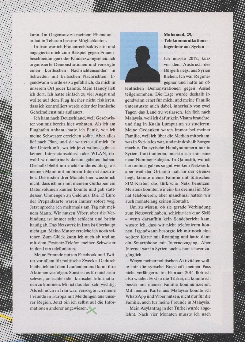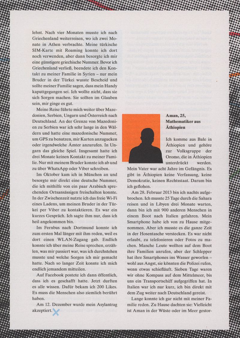 den falschen Pass hast, kannst du nirgendwohin. Dann hat die grenzenlose Welt plötzlich viele harte Grenzen. Ein Flüchtling braucht Wochen, um bis nach Deutschland zu gelangen, er Verlässt seine Familie, er gefährdet sein Leben, er gibt all seine Ersparnisse aus, er wird aufgehalten oder eingesperrt - aber wenn er es schafft, kann er an einem Montag um 15 Uhr eine Nachricht an seinen Bruder schicken und sagen, dass er angekommen ist. Und der Bruder kann diese