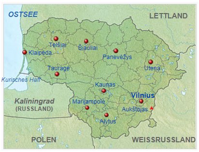 Litauen hat knapp 3 Millionen Einwohner, Deutschland ist 5 mal so groß, Litauisch ist wieder Amtssprache. Litauen ist das südlichste der baltischen Länder, grenzt im Westen an die Ostsee (mit dem eisfreien Hafen Klaipėda), im Norden an Lettland, im Osten an Weißrussland, im Süden an Polen und die russische Oblast Kaliningrad (das nördliche Drittel des früheren Ostpreußen mit Königsberg, Sitz der Baltischen Flotte).
