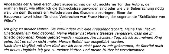 Die Prosa über das Wilnaer Getto ist Gemeinschaftsarbeit der Opfer, kumulierende Erinnerungsleistung, in der die Mitleidenden einander zitieren oder Zeugnis ablegen von der Simultanität des Schreckens. Die Wilnaer Juden trifft es in diesem Maßstab (80.000 im Getto; mehr als 100.000 Ermordete in Ponar) zuerst. In Wilna ist der Judenstern seit dem 3. Juli 1941 zu tragen.