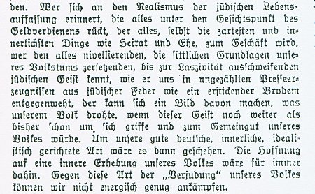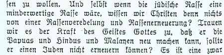 Dem Leser ruft er zu: Gerade wer von der Minderwertigkeit der jüdischen Rasse überzeugt ist, dürfte, wenn er nicht ein blinder Fanatiker ist, mit dem nicht zu rechten ist, nicht das Judenpogrom predigen, sondern müßte zur Judenmission aufrufen, weil in ihr die Kraft liegt, die Juden auch rassisch zu veredeln. Trotzdem lehnt er Eindeutschung der Juden ab, das verderbe das deutsche Volk rassisch, Gott habe jedem Volk seine völkische Eigenart und seine rassischen Besonderheiten doch nicht dazu gegeben, damit es seine völkische Prägung in rassisch unterwertige Mischlingsbildungen auflösen läßt. Gelten müsse der Grundsatz, daß die Treue gegen das eigene Volk eine ernsthafte Christenpflicht ist. So wenig wir Mischehen etwa mit naturalisierten Slaven gutheißen können, so wenig können wir Mischehen zwischen Deutsch-Stämmigen mit Juden billigen.
