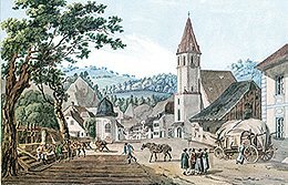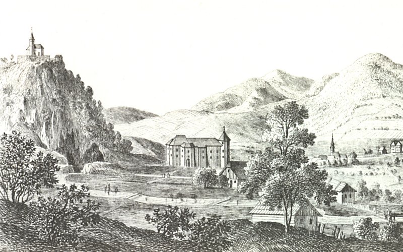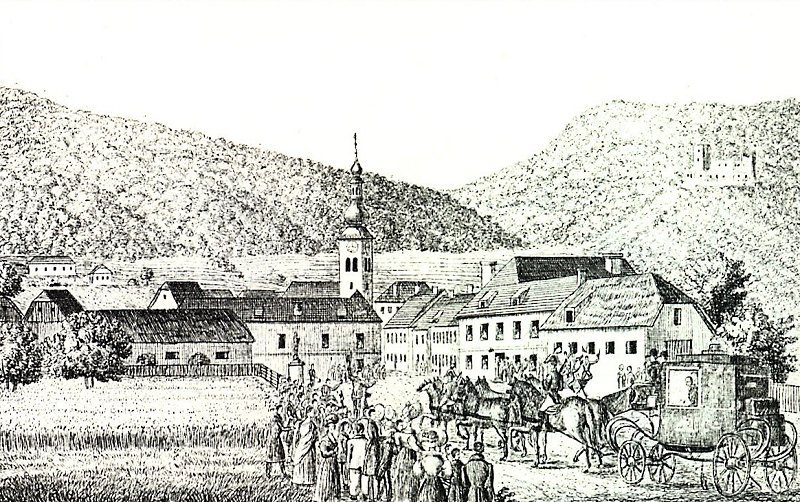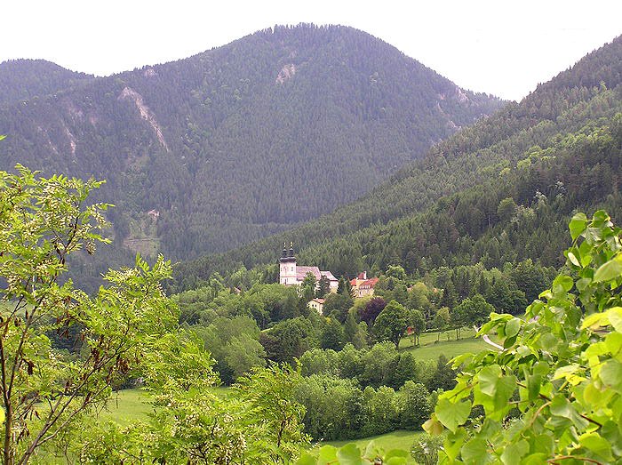 Seume wandert weiter nach dem Städtchen Schottwien, rechts oben grüßt Kloster Maria Schutz.