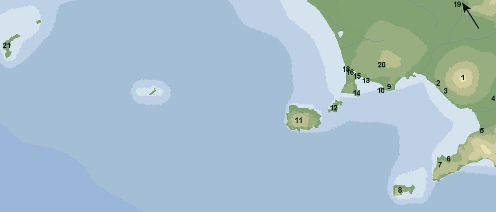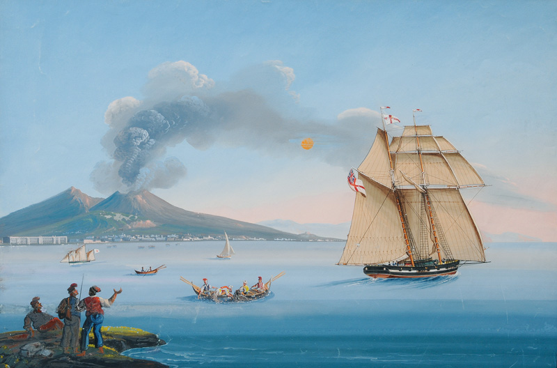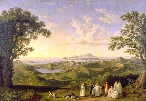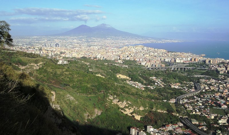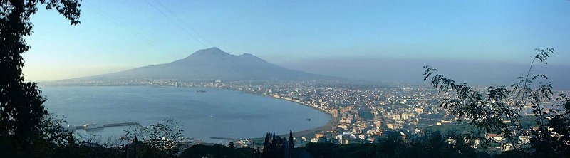 Rundumher liegt das ganze schöne magische klassische Land unter Einem Blick. Portici [Ercolano], das auf der Lava der Stadt des Herkules steht, der sich emportürmende Vesuv mit dem Somma, Torre del Greco, Pompeji, Stabiä, Surrent, Massa, Kapri, der ganze Posilippo, Nisida, Ischia, Procida, der ganze Meerbusen von Bajä mit den Trümmern der Gegend, Misene, die Thermen des Nero, der Lukriner See und hinter ihm versteckt der Avernus, die Solfatara, bei heiterm Wetter die Berge von Kumä, der Gaurus und weiterhin die beschneiten Apenninen; unten der Agnano mit der Hundsgrotte, deren Eingang nur ein hervorspringender Hügel bedeckt; der neue Berg hinter der Solfatara; alte und neue Berge, ausgebrannte und brennende Vulkane, alte und neue Städte, Elysium und die Hölle: alles dieses fassest Du mit Deinem Auge ...