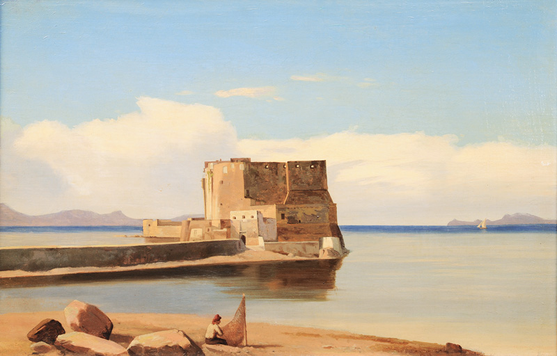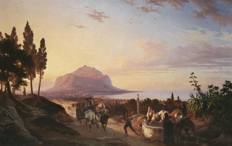 Unter ihm steht ein Zitronengarten in der schönsten Glut der Früchte; und links und rechts übersieht er die Bucht von der Spitze des Vorgebirges rund herum bis hinüber nach Ischia und Procida.