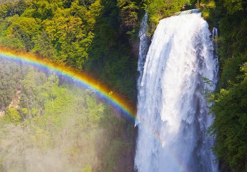 Nun stieg ich, ob ich gleich diesen Tag schon durch vier Meilen Apenninen von Spoleto herüber gekommen war, noch eine deutsche Meile lang den hohen Steinweg zu dem Fall des Velino hinauf. Das war Belohnung. Der Tag war herrlich; kein Wölkchen, und es wehte ein lauer Wind, der nur in der Gegend des Sturzes etwas kühl ward. Die Sonne stand schon etwas tief und bildete aus der furchtbaren Schlucht der Nera hoch in der Atmosphäre einen ganzen hellen, herrlich glühenden und einen größern dunkeln Bogen im Staube des Falles. Ich saß gegenüber auf dem Felsen, und vergaß einige Minuten alles, was die Welt sonst großes und schönes haben mag. Etwas größeres und schöneres von Menschenhänden hat sie schwerlich aufzuweisen.
