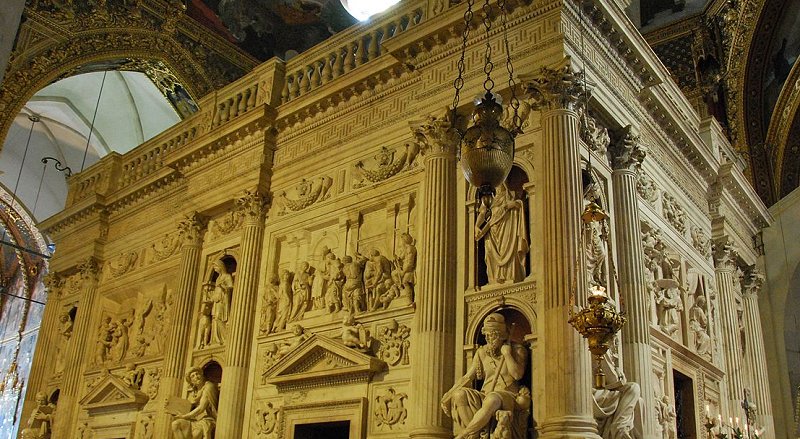 In Loretto macht er der "traurigen Dame" seinen Besuch, lässt sich ein halbes Dutzend hochgeweihte Rosenkränze anhängen,