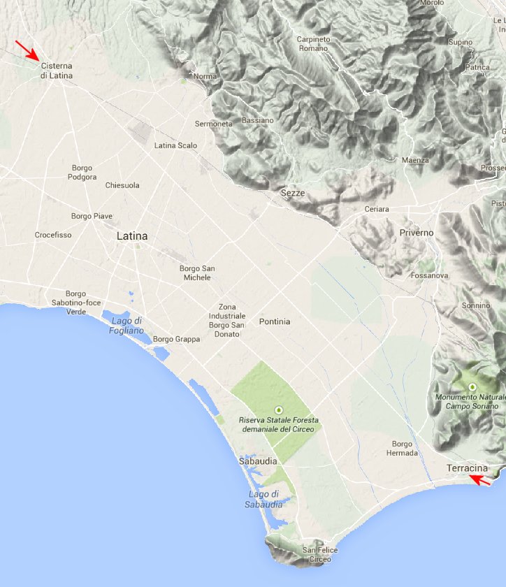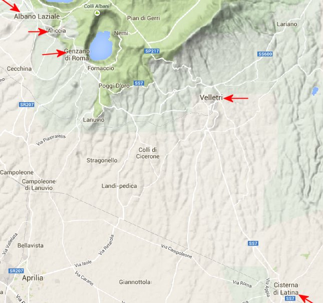 Tags darauf geht Seume weiter über Aricia [Ariccia], nach Gensano und Veletri und immer in die Pontinen hinein. Er trifft einen französischen Offizier, in Cisterne wollen sie übernachten; aber das Wirtshaus hatte die schlechteste Miene von der Welt, und sie wandern weiter bis bis Torre di tre ponti, wo sie nur ein Heulager bekommen.