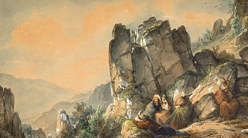 . . . ritten nunmehr aus der waldigen Region in den Schnee hinein. Ungefähr eine Viertelstunde über dem Hause und der Höhle hörte die Vegetation ganz auf und der Schnee fing an hoch zu werden, der schon um das Haus her und hier und da neu und alt lag. Wir mußten nun absteigen und unsere Maultiere hier lassen. Der Schnee ward bald sehr hoch und das Steigen sehr beschwerlich. Unsere Führer rieten uns nur langsam zu gehen, und sie hatten Recht: aber die Herren ruhten zu oft absatzweise, und darin hatten diese nicht Recht.