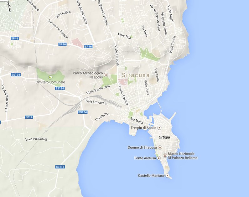 Nachdem ich in der Deposito bagagli al mano, was Handgepäckaufbewahrung heißt, wie jeder Europäer aus der Aufschrift erkennen wird, meine Reisetasche deponiert habe, begebe ich mich in die Stadt. Das alte Syrakus liegt auf einer Insel in einer breiten Bucht des Ionischen Meeres. Es ist erst 1/2 9 Uhr, doch die Hitze ist fast unerträglich, ich bin froh, in den tiefen Gassenschluchten der Altstadt Schatten und Kühlung zu finden. Syrakus hat als ständig bewohnte Stadt keine Bebauung aus der Griechenzeit mehr erhalten. Es gibt an der Schmalseite des die Stadt umgebenden Wassers, das jetzt mit einer breiten Brücke überquert wird, Reste einer altgriechischen Befestigung. Ansonsten bietet die Stadt ein Bild, das dem ihrer jüngsten Blütezeit, dem Barock, während der Bourbonenherrschaft entspricht.