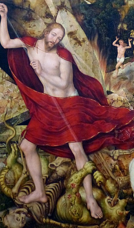 links von sich selbst als Auferstandener (?), der Tod (wie?) und Teufel (gibt es den?) besiegt. Und zwar mit einer