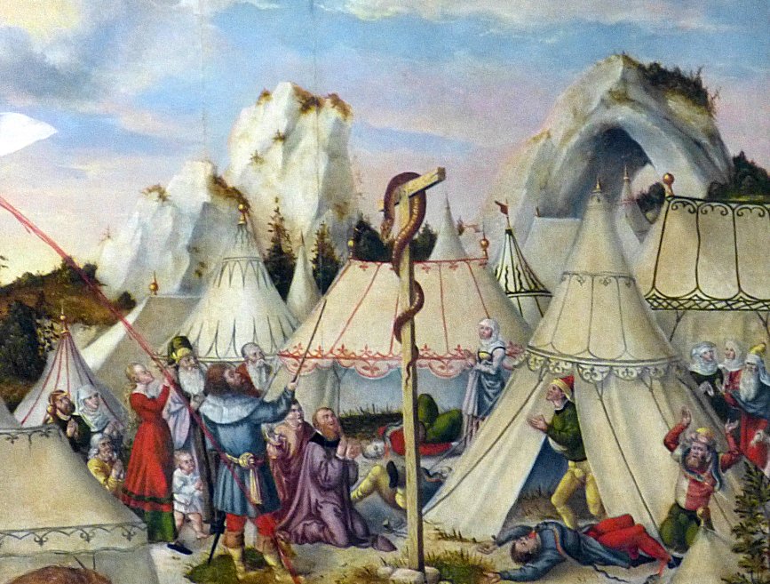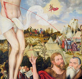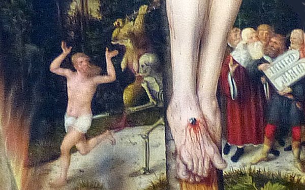 Die Kirchenleute interpretieren den gezielten Blutstrahl aus der Wunde des Gekreuzigten auf Cranachs Haupt so: