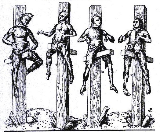 Personen, die an eichenen Pfählen emporgesetzt, angeschmiedet, und mit Feuer wie Ziegel jämmerlich geschmäucht